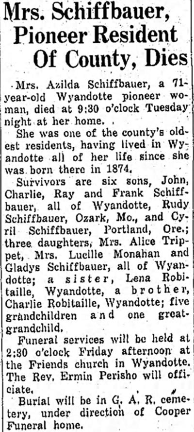 ![]() Azilda Ella Robetaillie Scvhiffbauer ”1874 - 1946” ![]() | |