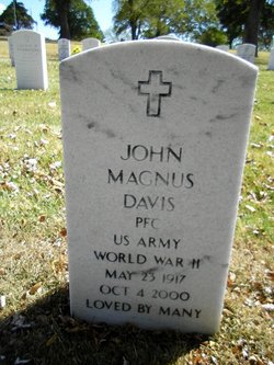 John Magnus Davis was born on May 23, 1918, in Ok. Parents: John K and dossie Betten Davis. Joy Davis was his twin. He married Marilyn Lorraine Swanson on December 5, 1957. He died on October 4, 2000, in Pittsburg, Kansas, at the age of 82, and was buried in Fort Scott, Kansas. May 23, 1918 - October 4, 2000 WWII Veteran US Army Resource: Ancestry.com |