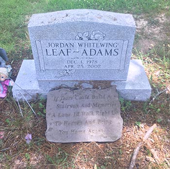 Jordan Whitewing Leaf Adams was born on December 1, 1978, the daughter of Sally Whitetree Leaf. She died on April 25, 2002, at the age of 23, and was buried in Grove, Oklahoma. Resource: findagrave.com |