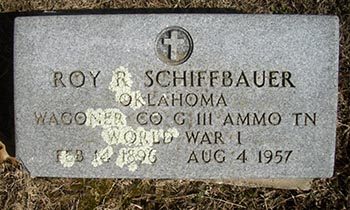 Roy Russell Schiffbauer was born on February 14, 1896, in Ok. Parents: Robert and Azilda Robetaillie Schiffbauer He married Anna Ferguson on September 22, 1920, in Joplin, Missouri. He died on August 4, 1957, in his hometown at the age of 61, and was buried in Wyandotte, Oklahoma. Resource: Ancestry.com |